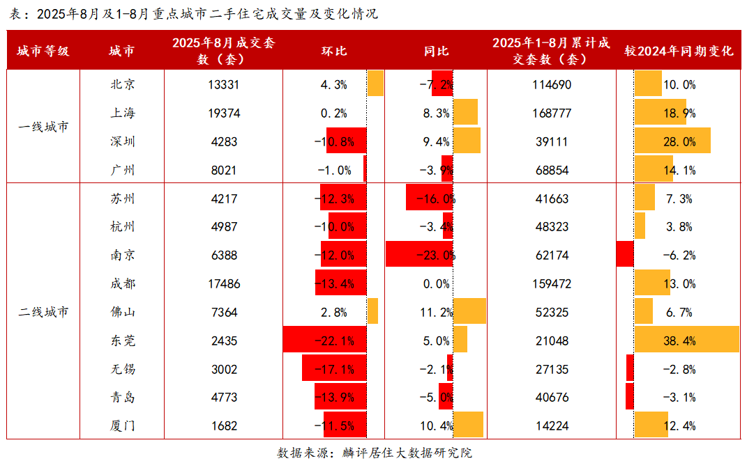 同比方面,前8月一线城市二手房成交量均超去年同期水平,二线)同比出现下降。