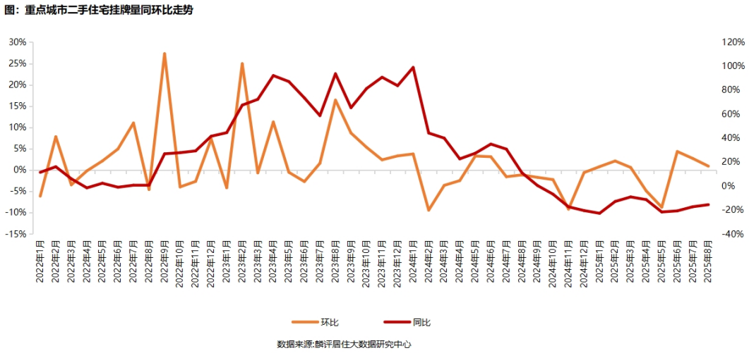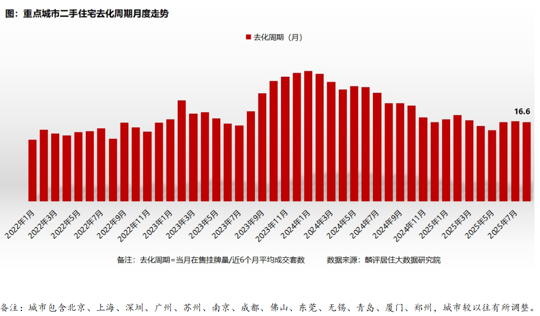 值得注意的是,二手房挂牌量虽然上升,但增速放缓,去化周期有所下降。报告显示,8月重点城市的二手房去化周期为16.6个月,环比下降1.4%,同比下降19.5%。去化压力较去年高峰期有所下降,房屋流动性压力缓解。